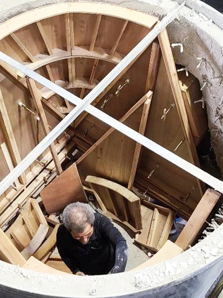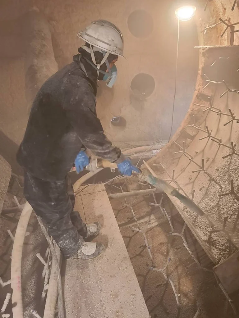 耐火セメント(正式名称キャスタブル)を使用し、型枠施工、吹き付け施工、塗り込み施工など用途によって色々な施工方法があります。